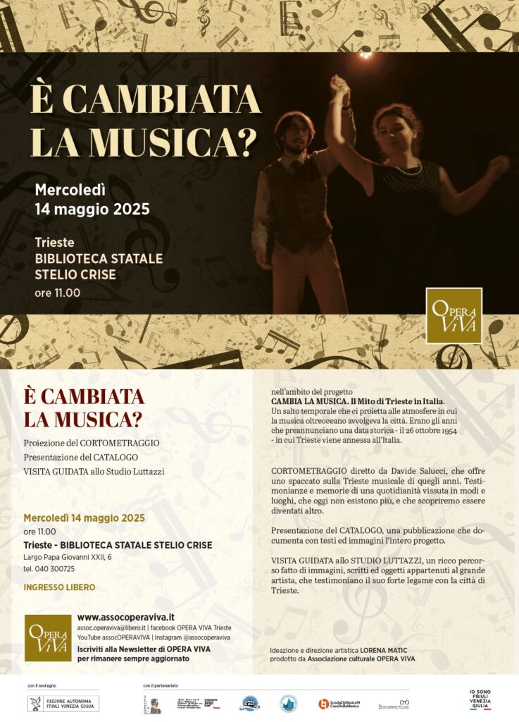 Con la proiezione del cortometraggio “È cambiata la musica” diretto dal regista triestino Davide Salucci – alla Biblioteca Statale Stelio Crise, mercoledì 14 maggio, alle ore 11.00 (ingresso libero) – si conclude il progetto “Cambia la Musica. Il Mito di Trieste in Italia“, prodotto da Opera Viva Associazione culturale, ideato e diretto da Lorena Matic, dedicato alle celebrazioni dei 70 anni di Trieste all’Italia, con un’osservazione alla musica che influenzò la quotidianità a Trieste nel secondo dopoguerra, a sua volta influenzata dalla musica oltreoceano del Governo Militare Alleato.
