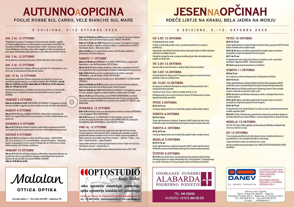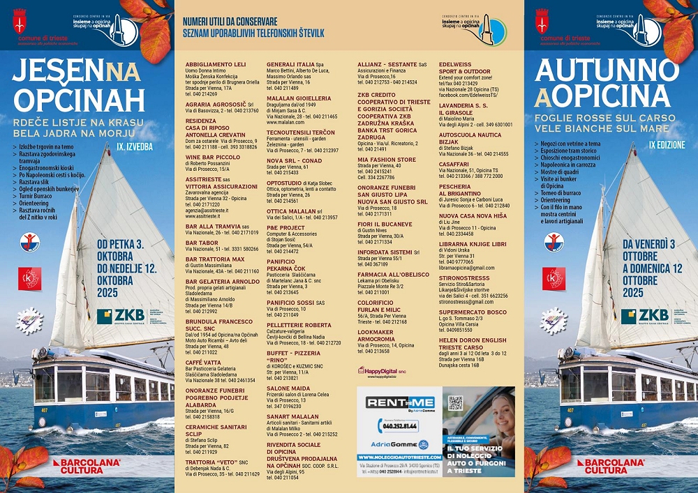Con il ritorno della “Barcolana”, in contemporanea con la regata più partecipata del mondo, il borgo carsico di Opicina, dalle cui vedette si può godere di una vista privilegiata sulla Coppa d’Autunno, anche quest’anno propone una nuova edizione dell’ormai tradizionale manifestazione “Autunno a Opicina –Foglie rosse sul Carso, vele bianche sul mare” giunta nel 2025 al suo decimo anno. la 10ª edizione di “Autunno a Opicina – Foglie rosse sul Carso, vele bianche sul mare”, è stata inserita del calendario degli eventi di Barcolana.