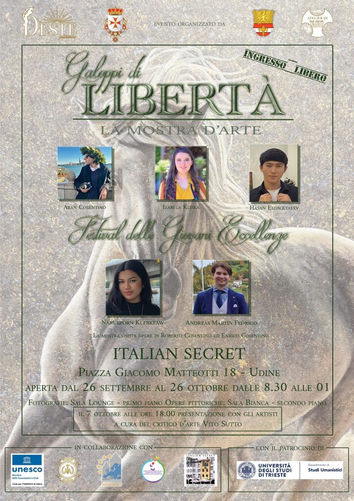 Dopo il successo del Festival Internazionale delle Giovani Eccellenze a Trieste, la mostra d’arte “Galoppi di libertà” è giunta nel cuore di Udine. L’esposizione, organizzata dall’associazione no profit Atelier di Creatività, è visitabile presso il locale Italian Secret in Piazza Giacomo Matteotti n. 18.
