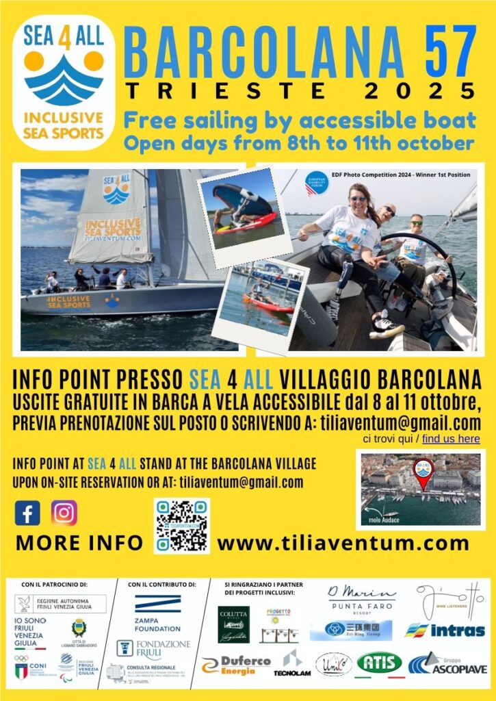 Sea4All sarà anche presente con uno stand presso il Villaggio Barcolana sulle rive di Trieste di fronte a piazza Unità d’Italia dal 8 al 12 ottobre dove lo staff sarà affiancato da attivi volontari amici del CSM di Gorizia e di ANFASS Udine pronti ad accogliere tutti e informare riguardo le attività senza barriere, le esperienze di inserimento lavorativo ed i progetti realizzati con i Partner tra cui DiversamenteDOC (venite a trovarci e capirete di persona di cosa si tratta), le possibilità offerte dal territorio regionale in termini di accessibilità, in particolare sportive ed esperienziali, le ultime e aggiornate soluzioni/ accorgimenti/ attrezzature/ ausili/ allestimenti/ procedure per vivere il mare, il vento, la vela ed altri sport, o anche per vivere serenamente momenti aggregativi.