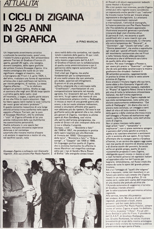 Zigaina opera grafica 1 947-1972, curata da Giuseppe Marchiori e inaugurata il 26 luglio 1973 a Palazzo Torriani, segnò una tappa fondamentale nel dibattito critico dell’artista. Ora rievocare quella mostra signifi ca mettere a fuoco un momento particolarmente vitale della cultura isontina, in cui si pongono le basi per la fondazione della Galleria, che sarebbe stata inaugur ata nel 1977: un “laboratorio”, che vide proprio Giuseppe Marchiori e Giuseppe Zigaina come figure centrali, in stretto rapporto con Bruno Patuna. L’itinerario conduce il visitatore negli spazi della mostra del 1973, attraverso le immagini fotografiche conservate nell’archivio della Galleria e nell’archivio Zigaina, che consentono di ricostruire l’ allestimento, individuare le opere esposte e rivivere il momento dell’inaugurazione, che vide protagonisti, accanto al pittore e al critico, personaggi come Pier Paolo Pasolini, Alida Valli, Pasquale Festa Campanile, Marcello Mascherini, solo per fare qual che esempio. In esposizione anche un nucleo emblematico di disegni, in gran parte proposti nel 1973.