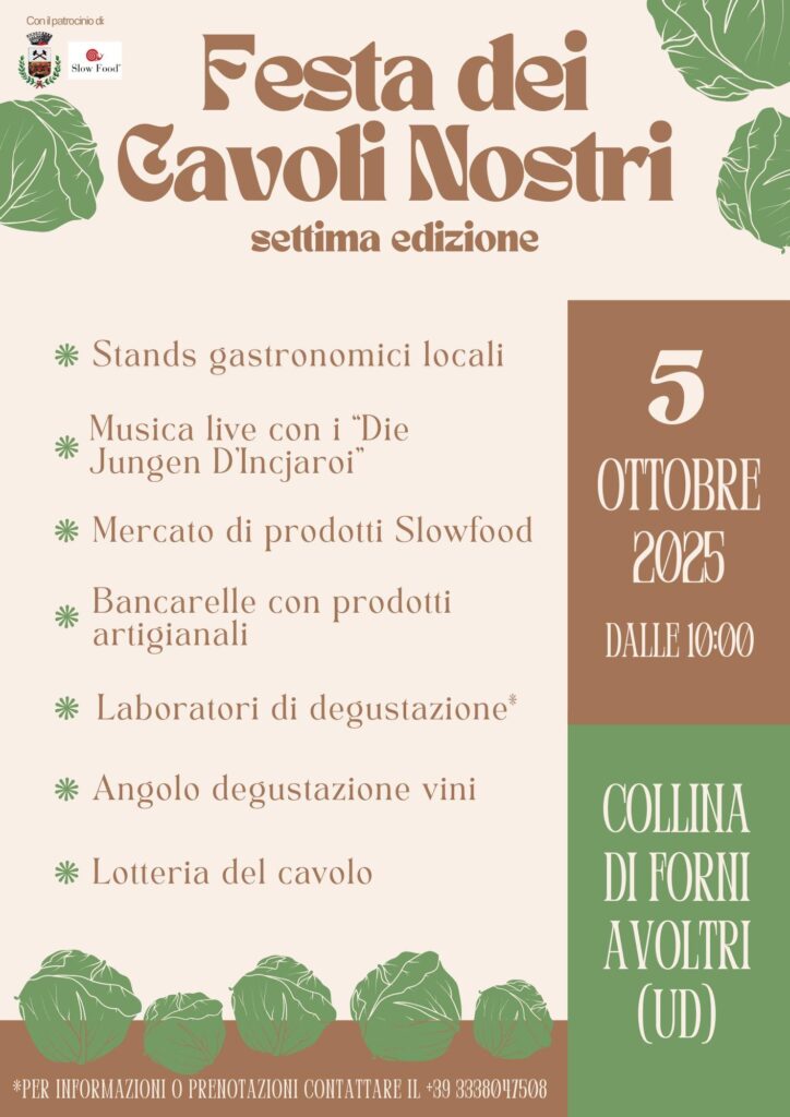 Tutto pronto per la Festa dei Cavoli Nostri, l’appuntamento più atteso dell’autunno carnico dedicato al cavolo cappuccio e alle eccellenze agroalimentari di montagna. Domani, domenica 5 ottobre, dalle ore 10, Collina di Forni Avoltri si trasformerà in un vivace villaggio del gusto, dell’incontro e della cultura rurale, con una giornata ricca di attività tra sapori locali, musica dal vivo, momenti divulgativi e incontri istituzionali sul futuro delle Terre Alte.