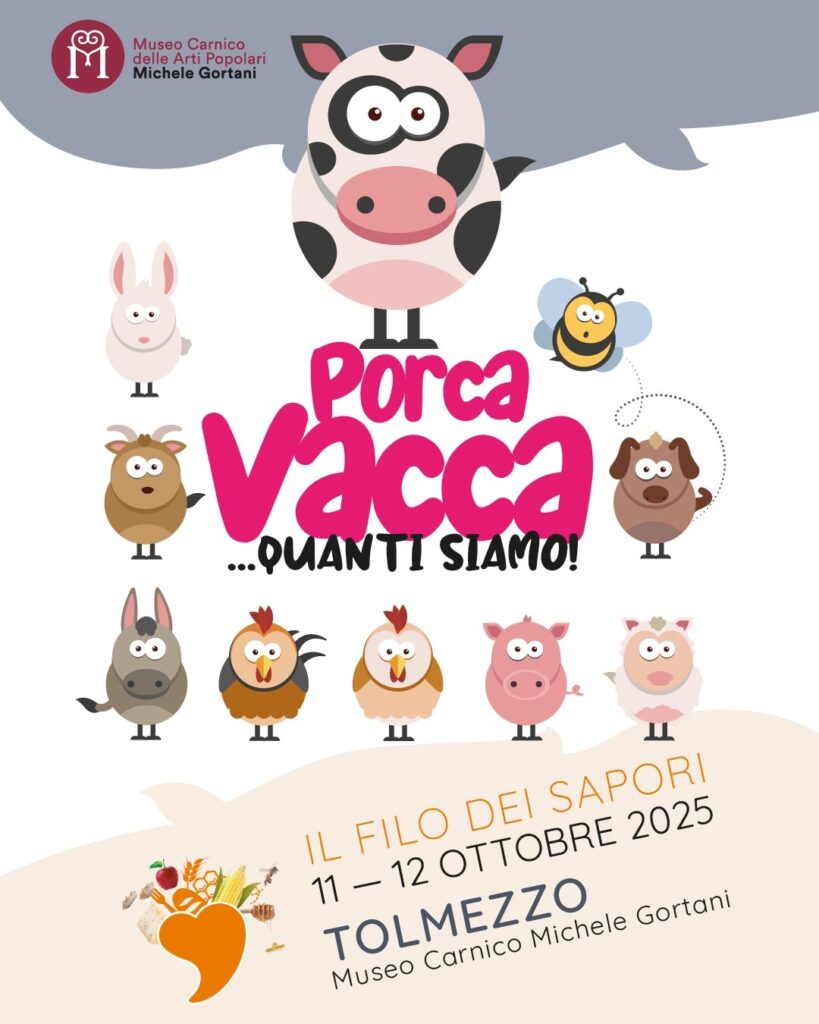 In occasione dell’edizione 2025 de “Il Filo dei Sapori”, Festival dei prodotti agroalimentari del Friuli Venezia Giulia promosso dalla Comunità di Montagna della Carnia in collaborazione con ERSA, Enti ed Associazioni del territorio, al Museo Carnico delle Arti Popolari “Michele Gortani” di Tolmezzo torna “Porca vacca… quanti siamo!”, il percorso interattivo ed esperienziale che accompagna i più piccoli alla scoperta degli animali della fattoria. Nelle giornate di sabato 11 e domenica 12 ottobre, dalle 10.00 alle 17.00, tantissime attività e laboratori tematici con gli esperti animeranno gli spazi esterni del Museo per avvicinare bambine e bambini al mondo degli animali e riscoprire tradizioni, usi e oggetti del passato che ne fanno parte.