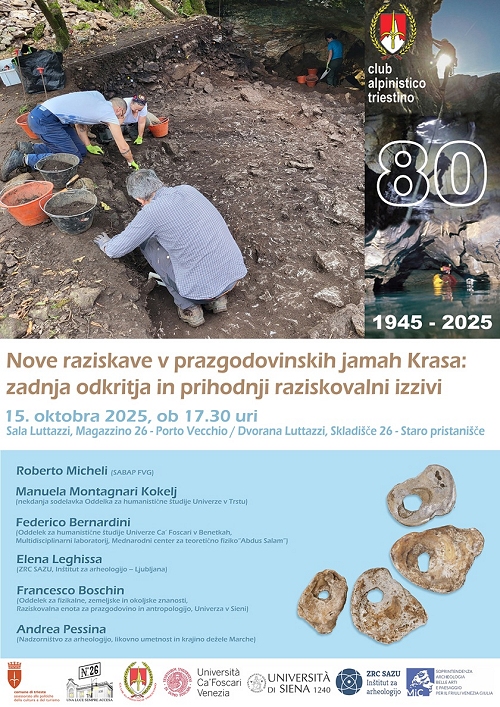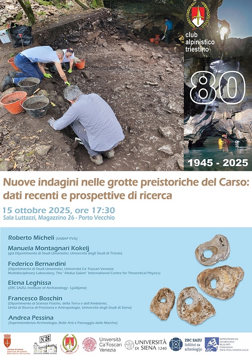 In questa occasione, saranno presentati i risultati di recenti ricerche in ambiente speleologico del Carso triestino: gli scavi condotti su concessione del Ministero della Cultura dal Dipartimento di Studi Umanistici dell’Università Ca’ Foscari Venezia, in collaborazione con l’Institute of Archaeology ZRC SAZU, dal Centro Internazionale di Fisica Teorica Abdus Salam e dall’Unità di Ricerca di Preistoria e Antropologia dell’Università degli Studi di Siena, e le indagini direttamente eseguite dalla Soprintendenza Archeologia, Belle Arti e Paesaggio per il Friuli Venezia Giulia nell’ambito della propria programmazione lavori.