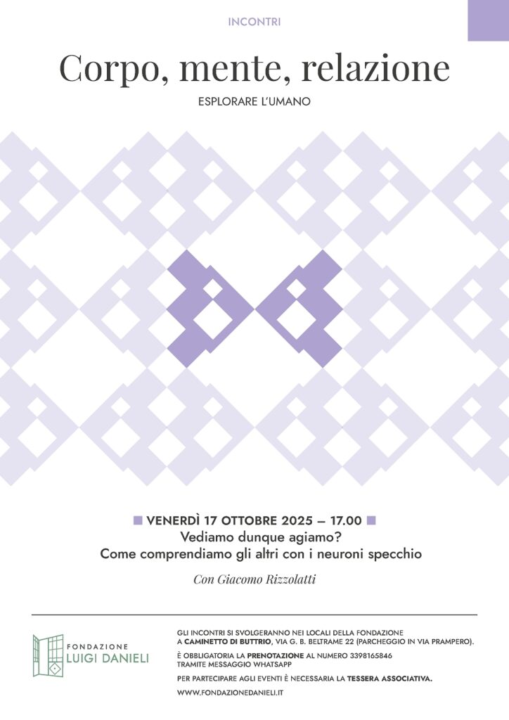 Venerdì 17 ottobre 2025 alle 17.00 alla Fondazione Danieli il neuroscienziato Giacomo Rizzolatti terrà la lezione Vediamo, dunque agiamo? Come comprendiamo gli altri con i neuroni specchio, in cui ripercorrerà gli studi che hanno consentito di scoprire i neuroni specchio, mostrando come essi siano alla base della nostra facoltà di comprendere le azioni e le emozioni altrui; una comprensione che avviene dall’interno, poiché poggia sulla capacità di rappresentare ed esperire quelle azioni o quelle emozioni in prima persona: osservare gli altri agire o provare un’emozione non è poi così diverso da quando agiamo o proviamo un’emozione in prima persona. È questo a renderci esseri intrinsecamente sociali.