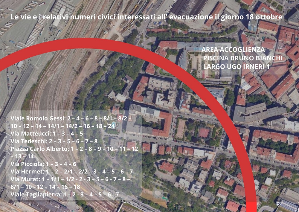• evacuazione di tutta la cittadinanza interessata, residente e domiciliata negli edifici ubicati entro il raggio di 468 mt. lineari dal luogo di ritrovamento dell’ordigno, l’area include piazza Carlo Alberto, il Passeggio Sant’Andrea, nelle vie Gessi, Matteucci, Tedeschi, Picciola, Hermet, Murat, Tagliapietra(vedasi Ordinanza allegata, per i numeri civici dettagliati, e relativa Planimetria, la quale è parte integrante e sostanziale della stessa Ordinanza);