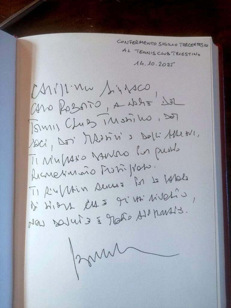 Il presidente del Tennis Club Triestino Bruno Zvech ha lasciato un ricordo scritto sul Libro d’Oro del Comune di Trieste recante la seguente dicitura: