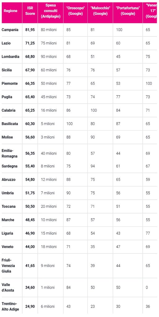 L’indice mostra un’Italia divisa: il Sud resta più legato ai simboli della fortuna e alle tradizioni magiche, mentre il Nord tende a razionalizzare il rapporto con il destino, pur mantenendo una traccia di superstizione quotidiana.