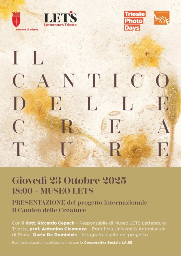 Trieste Photo Days in collaborazione con il Comune di Trieste, LETS-Letteratura Trieste e La.Se. Società Cooperativa Sociale presenta “Il Cantico delle Creature”, un progetto fotografico internazionale, nato in occasione dell’ottavo centenario del Cantico di San Francesco d’Assisi, che ha invitato autori da tutto il mondo a raccontare, con le immagini, la bellezza e le virtù del creato insieme alle sue ferite causate dall’impatto umano.