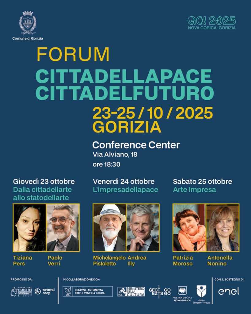 Il Forum è sostenuto e promosso dal Comune di Gorizia, Regione Autonoma Friuli Venezia Giulia, Ministero della Cultura, GECT GO!, Comune di Nova Gorica e Comune di Sempeter – Vrtojba. È realizzato da Cittadellarte – Fondazione Pistoletto insieme a Netural Coop, protagonista a Gorizia in via Rastello 19/21 con l’hub di innovazione sociale Casa Netural Gorizia e partner de La Via del BorGO nell’ambito del PNRR Bando Borghi.