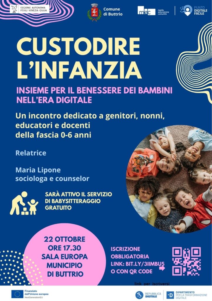 Andare incontro alle difficoltà degli alunni è il filo conduttore degli interventi predisposti dall’amministrazione comunale di Buttrio nelle tre scuole pubbliche. Si parte mercoledì 22 ottobre alle ore 17.30 in Municipio (sala Europa) con l’incontro “Custodire l’infanzia”, dedicato a docenti, nonni e genitori di bambini da 0 a 6 anni, a cura della sociologa e counselor Maria Lipone. L’appuntamento intende rafforzare l’alleanza fra scuola e famiglie con l’obiettivo comune del benessere dei più piccoli. Particolare attenzione sarà data alle abitudini digitali dei genitori e conseguente sviluppo psicomotorio dei figli. Iscrizione obbligatoria tramite il sito web del Comune di Buttrio. Sarà attivo per i partecipanti un servizio gratuito di baby sitter.