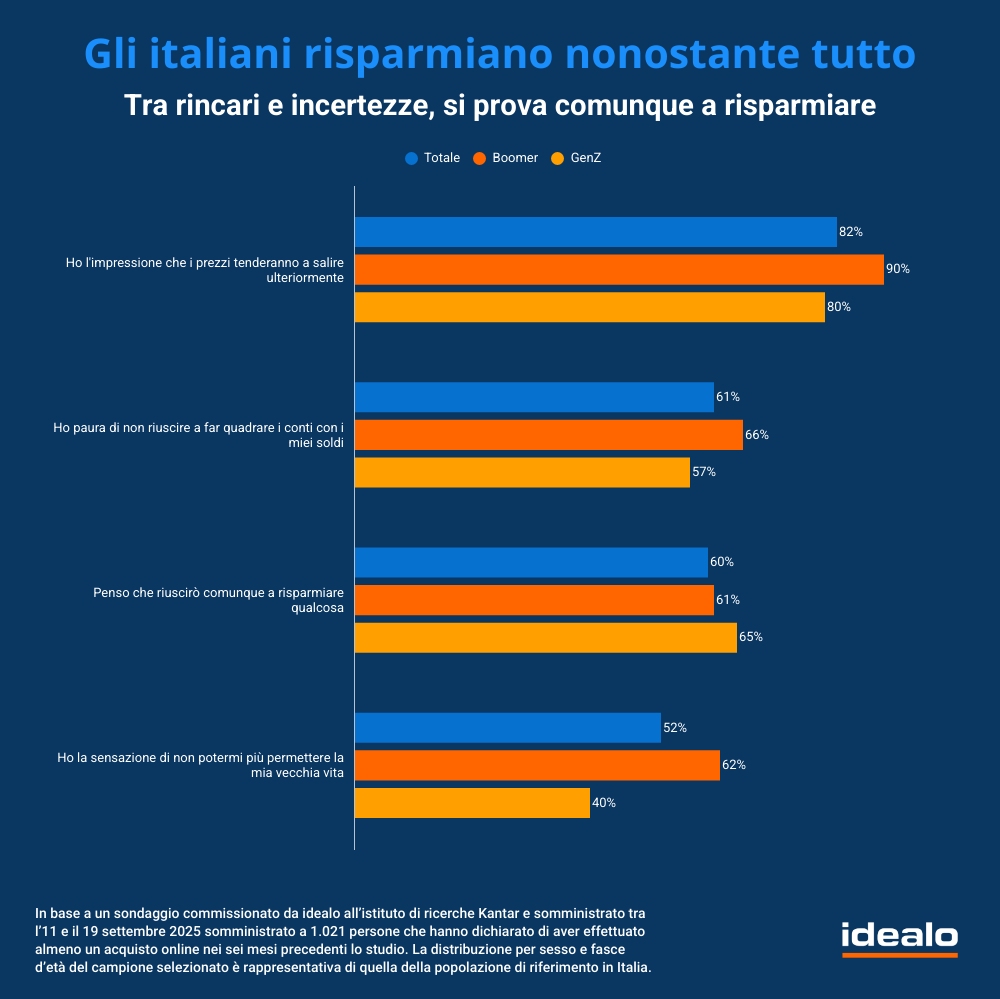 Secondo i dati dell’indagine Kantar per idealo – portale internazionale leader nella comparazione prezzi – c’è ancora molta paura per i rincari che non si fermeranno e per non riuscire a coprire le spese con le proprio entrate. La GenZ si rivela più previdente dei Boomer ed è già attenta al risparmio.