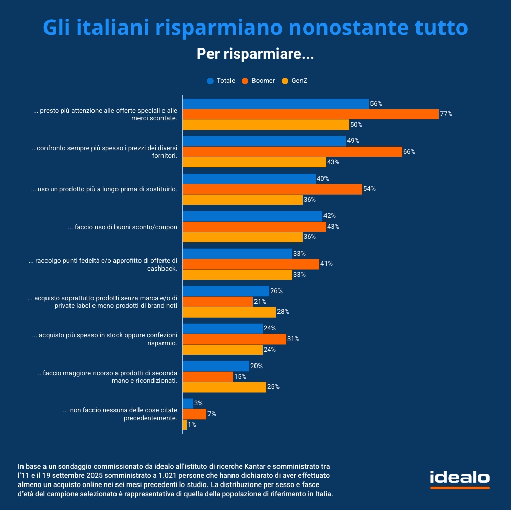 Una curiosità, quando si tratta di spendere per gli altri, quindi magari per un regalo o un acquisto necessario che non serve però direttamente a noi, gli italiani tendono ad essere più generosi e a guardare meno al prezzo: ben più della metà (56%) afferma di risparmiare di più quando si tratta di prodotti per il proprio uso personale rispetto a quando acquista qualcosa per gli altri.