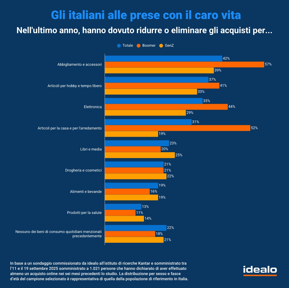 Al contrario, risultano meno soggetti a riduzioni i consumi legati a prodotti per la salute (13%), alimentari e bevande (19%) e drogheria/cosmetici (21%), a conferma della natura essenziale di queste categorie.