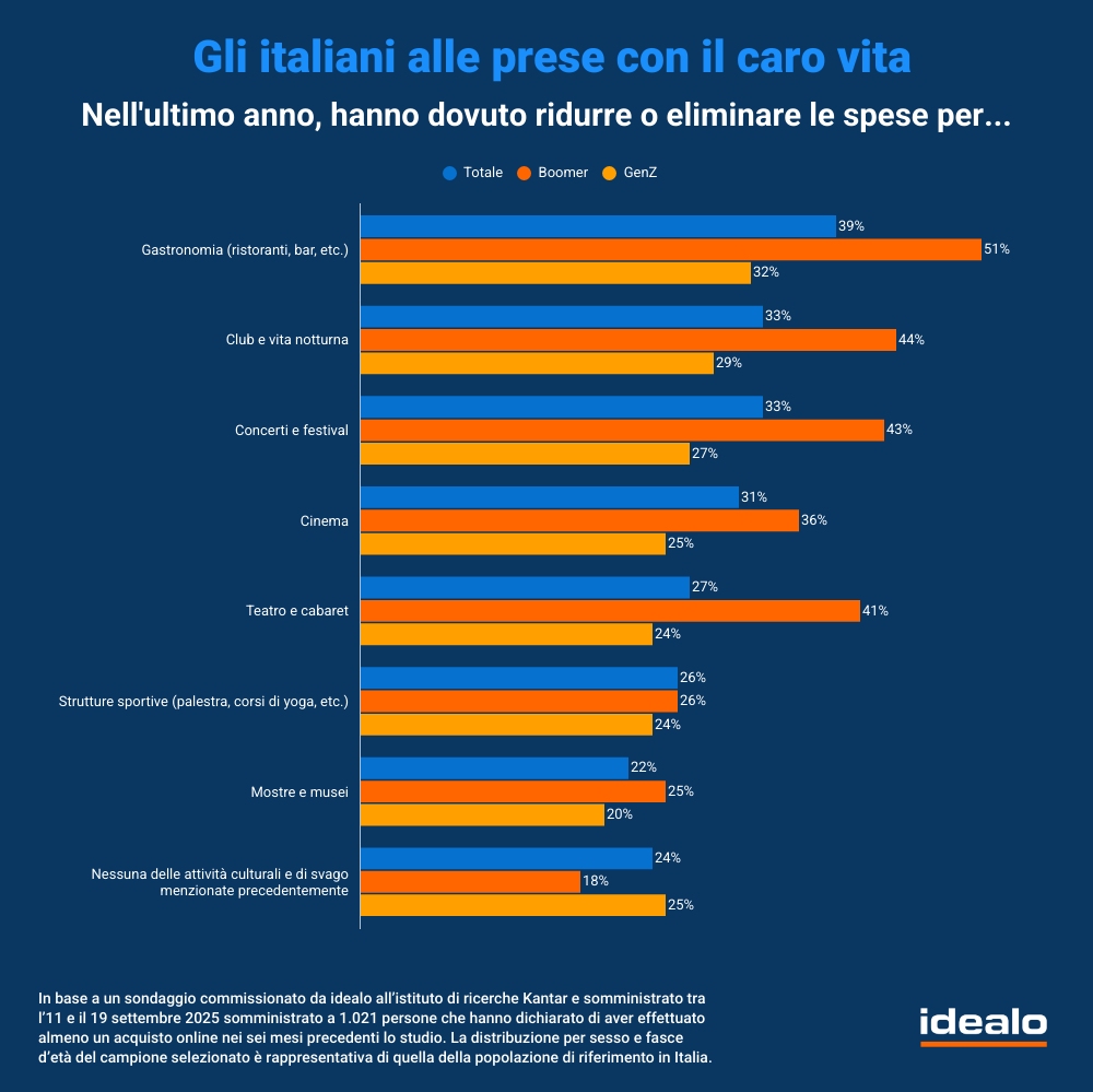 Tagli significativi sono stati attuati anche per quanto riguarda le attività culturali e di svago: quasi il 40% ha dovuto ridurre le spese relative a ristoranti e bar, mentre 1 italiano su 3 ha tagliato quelle legate a club e vita notturna, concerti e festival.