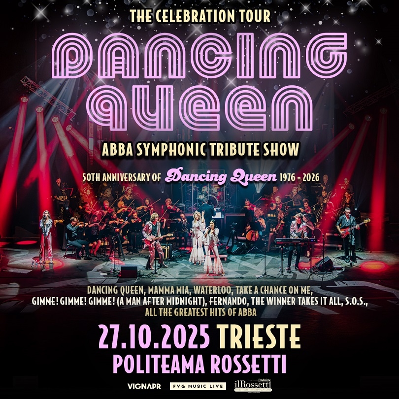 Dopo il successo del tour che nel 2023 ha riempito i teatri di tutta Europa, DANCING QUEEN – ABBA SYMPHONIC Tribute Showtorna dal vivo per tre imperdibili concerti nei teatri di Lubiana, Zagabria e Trieste: lunedì 27 ottobre (inizio ore 21:00) sul palco del Politeama Rossetti. I biglietti per il concerto organizzato da VignaPR, in collaborazione con FVG Music Live e ilRossetti, sono ancora in vendita online su Ticketone.it, Vivaticket.it e direttamente alle casse del teatro.