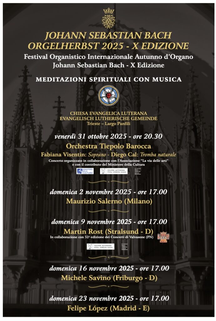 Grande avvenimento: La Chiesa Evangelica Luterana in Italia (CELI), che riunisce le comunità luterane dell’intera penisola, è lieta di annunciare che Venerdì 31 ottobre, alle ore 20.30, presso la Chiesa Luterana di largo Panfili, inizierà la Prima delle cinque meditazioni d’organo di altissimo livello del Festival Organistico Internazionale dedicate a Johann Sebastian Bach, organizzate dalla Comunità luterana di Trieste. Le meditazioni saranno inframezzate da letture ed orazioni.
