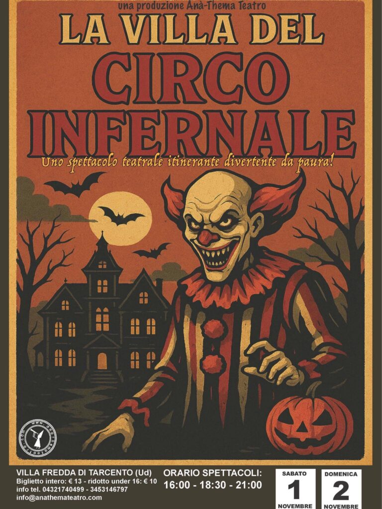 Dopo il successo delle passate edizioni, capaci di richiamare migliaia di spettatori da tutta la regione, l’edizione 2025 promette di superare ogni aspettativa con “Il Circo Infernale”, il nuovo spettacolo itinerante firmato Luca Ferri, che andrà in scena, con tre repliche al giorno (alle 16, alle 18.30 e alle 21) l’1 e il 2 novembre negli spazi suggestivi di Villa Fredda di Tarcento.