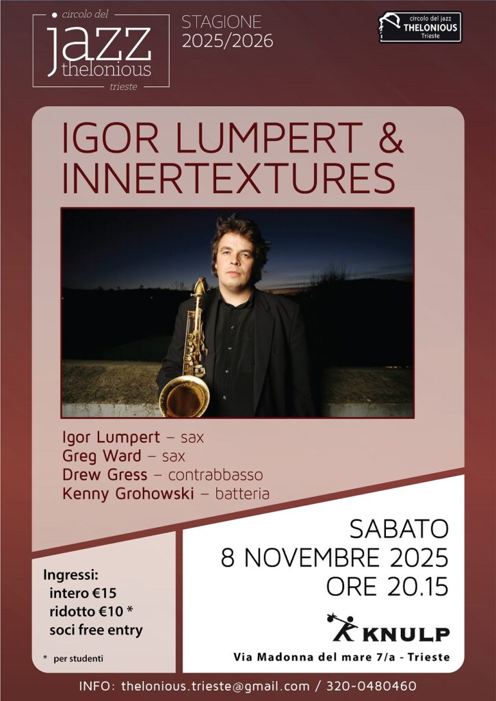 Sabato 8 novembre, alle ore 20.15 presso il Knulp in via della Madonna del mare 7/a a Trieste, il Circolo del Jazz Thelonious presenta IGOR LUMPERT & INNERTEXTURES (Igor Lumpert – sax / Greg Ward – sax / Stephan Crump – contrabbasso / Kenny Grohowski – batteria).