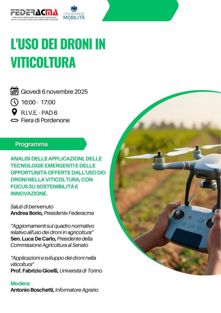 Il giorno successivo, giovedì 6 novembre alle ore 16:00, si parlerà invece de “L’uso dei droni in viticoltura”, analizzando applicazioni, scenari emergenti e potenzialità in chiave di sostenibilità. Tra i relatori: il senatore Luca De Carlo, presidente della Commissione Agricoltura del Senato e promotore della recente norma sul tema, il prof. Fabrizio Gioelli (Università di Torino), con la moderazione del giornalista Antonio Boschetti.