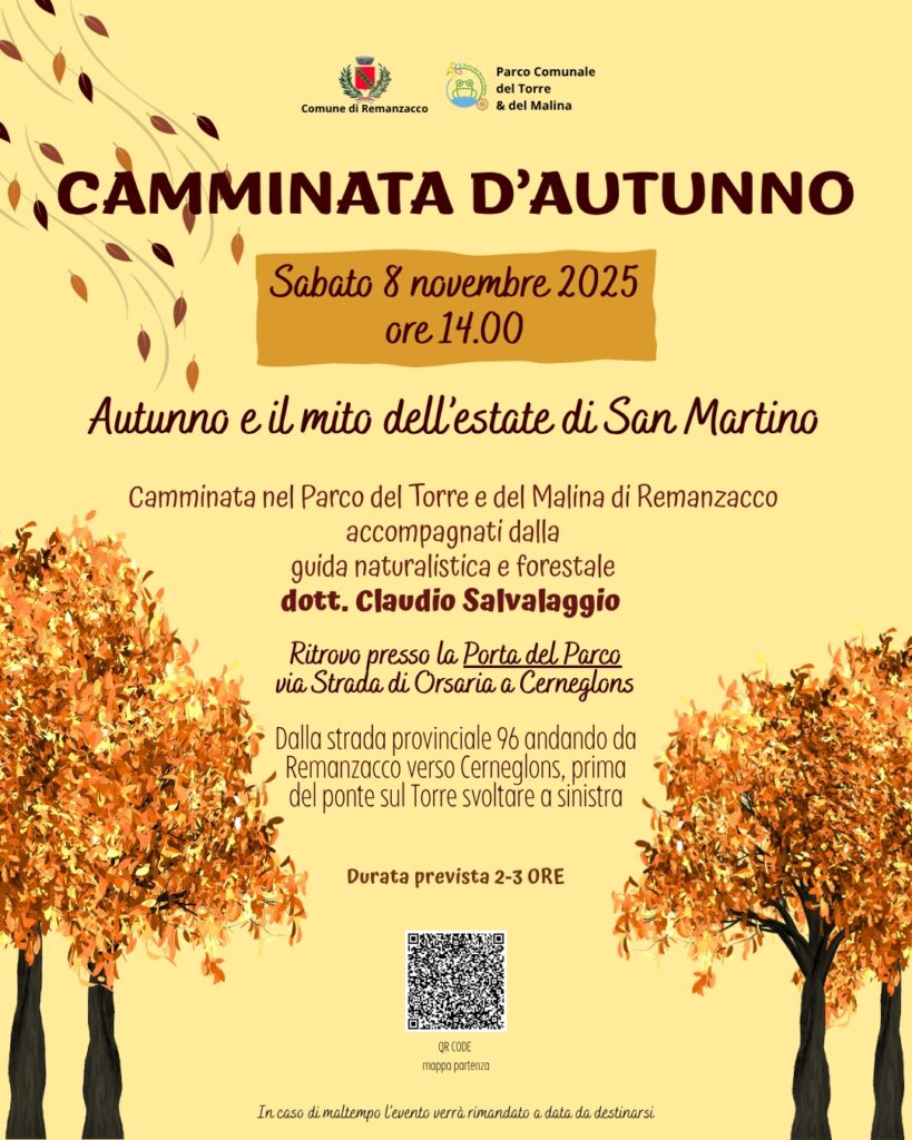 Un pomeriggio tra colori, racconti e paesaggi: sabato 8 novembre alle ore 14 prende il via la “Camminata d’autunno”, iniziativa promossa dal Comitato del Parco del Torre e del Malina del Comune di Remanzacco. La guida naturalistica e forestale Claudio Salvaggio condurrà i partecipanti lungo un percorso immerso nella suggestiva vegetazione autunnale, raccontando del “mito dell’estate di San Martino”.