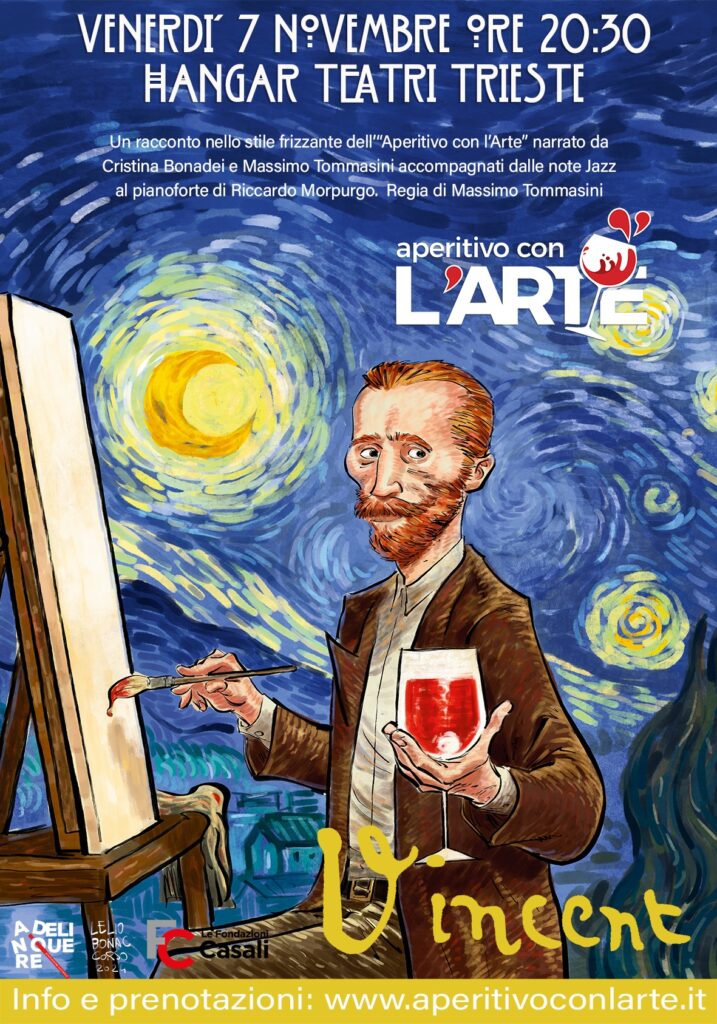 Venerdì 7 novembre alle ore 20:30, all’Hangar Teatri, si terrà “Aperitivo con l’Arte: Vincent”, un viaggio nella vita e nell’arte di Vincent van Gogh, raccontato in parole e musica dalla giornalista Cristina Bonadei, dal fotografo e regista Massimo Tommasini, e dal pianista Riccardo Morpurgo. Al termine dello spettacolo sarà offerto un aperitivo con i vini della Cantina I Magredi.