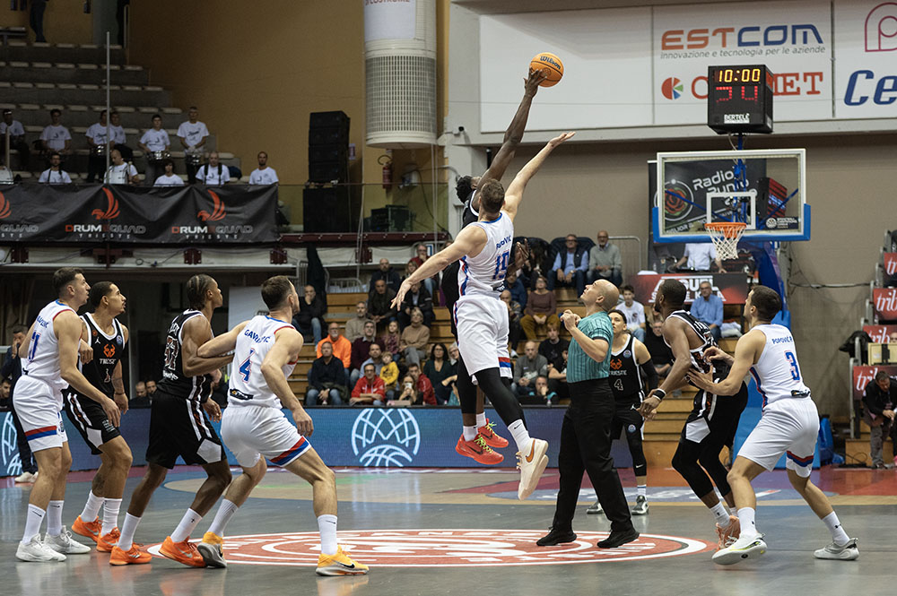 Trieste parte con Ross, Ramsey, Brown, Sissoko e Toscano-Anderson. Il primo canestro è di Sissoko con un bel giro e gancio, seguito dal tiro dalla media di Ramsey. Lewis risponde con una tripla, ma Toscano-Anderson recupera un passaggio di Igokea e lancia Ross, che alza per Brown una schiacciata spettacolare. Ancora Sissoko, questa volta su alzata di Ross, e poi Brown ruba palla e appoggia altri due punti. Igokea prova a reagire con Milosaljevic e un canestro da rimbalzo offensivo, ma Ramsey risponde con un coast to coast. Ross subisce fallo da N. Popovic e fa due su due ai liberi, poi lo stesso Popovic si riscatta con un semigancio. Ross recupera e serve Ramsey, che segna con il fallo. Tyree punisce con una tripla, seguito dal canestro da sotto di Popovic. Ramsey e Candussi sono precisi ai liberi, poi Moretti infiamma il palazzetto con una tripla in step-back. Ceaser risponde da sotto, poi l’ultimo tiro di Igokea non va: Trieste chiude avanti 23-16.