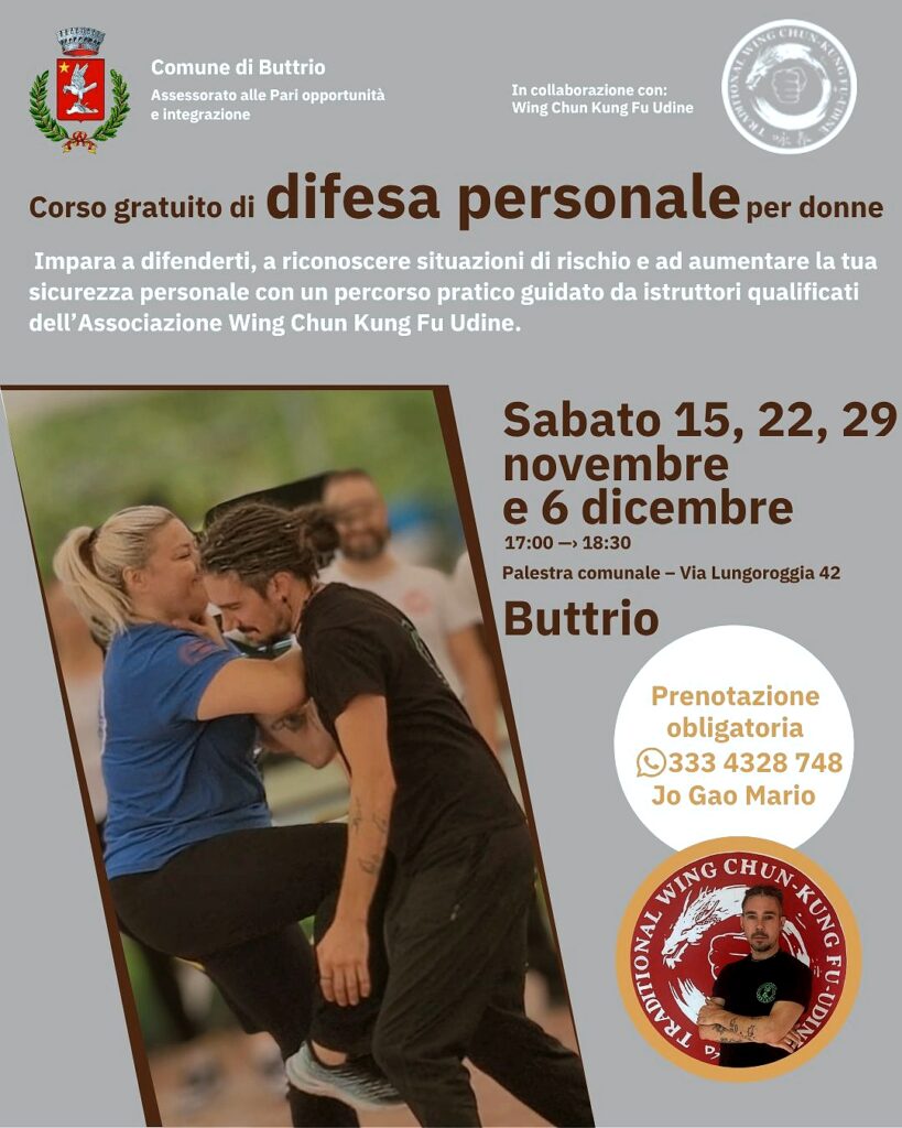 Dopo il successo della prima edizione svoltasi lo scorso marzo, l’assessorato alle Pari Opportunità e Integrazione del Comune di Buttrio rinnova l’impegno nella promozione della sicurezza femminile con un nuovo ciclo di appuntamenti dedicati alla difesa personale e alla prevenzione della violenza di genere, con il contributo della Regione Fvg – Direzione centrale lavoro, formazione, istruzione e famiglia, in collaborazione con l’associazione Wing Chun Kung Fu Udine. Il corso, gratuito e aperto a donne di ogni età, si svolgerà nella palestra comunale di via Lungoroggia nei pomeriggi di sabato 15, 22, 29 novembre e 6 dicembre, dalle ore 17 alle 18.30. “Tenuto da istruttori qualificati dell’associazione Wing Chun Kung Fu Udine, si propone di sensibilizzare le donne anche sull’importanza della consapevolezza e della capacità di chiedere aiuto in modo tempestivo – spiega l’assessora alle PO Corina Alionte -. Le partecipanti apprenderanno tecniche semplici ed efficaci, adatte a ogni condizione fisica, imparando a riconoscere situazioni di rischio, reagire con prontezza, adottare accorgimenti utili nella vita quotidiana”. La partecipazione è gratuita su  prenotazione. Per informazioni e iscrizioni contattare Jo Gao Mario Montefiori: 333.4328748.