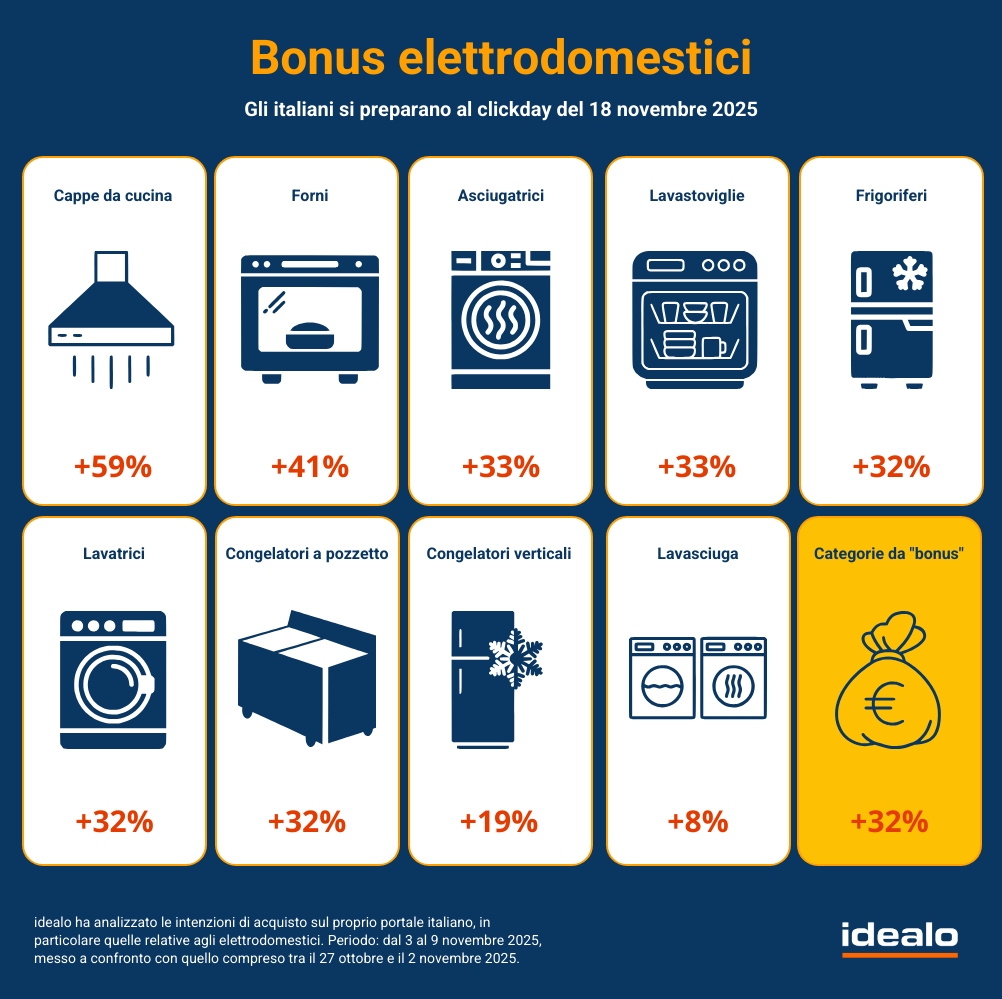 Secondo gli ultimi dati di idealo.it, portale leader in Europa nella comparazione prezzi, l’interesse per queste categorie è già alle stelle. Infatti, nelle ultime due settimane la categoria degli elettrodomestici protagonisti del bonus ha registrato una crescita media del +32%.
