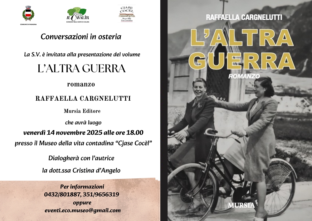 Novembre. mese di memoria e riflessione. In un intreccio di ricordi e consapevolezze si colloca idealmente il nuovo appuntamento del ciclo “Conversazioni in osteria”, in programma DOMANI, venerdì 14 novembre alle 18 all’Ecomuseo della Gente di Collina “Il Cavalîr” – Cjase Cocèl, Museo della Vita Contadina di Fagagna, con la presentazione del libro di Raffaella Cargnelutti, “L’altra guerra”.