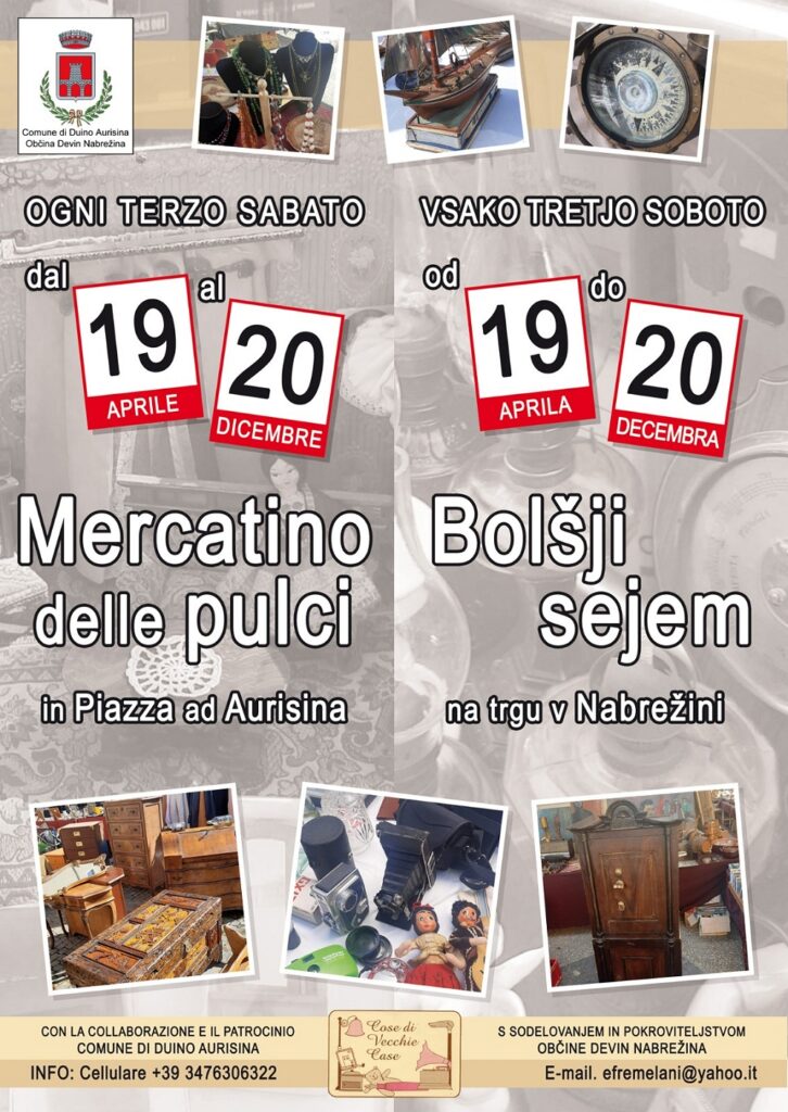 Forte del successo delle sette precedenti, sabato 15 novembre si terrà la settima delle uscite di quest’anno del Mercatino delle pulci a cura dell’Associazione culturale Cose di Vecchie Case allestito nella piazza principale di Aurisina con il patrocinio del Comune di Duino-Aurisina e che costituirà un appuntamento fisso mensile fino al 20 dicembre prossimo: una selezionata vetrina dedicata ad antiquariato, modernariato, creazioni artigianali e hobbistiche e del fai da te con espositori provenienti da tutta la regione.
