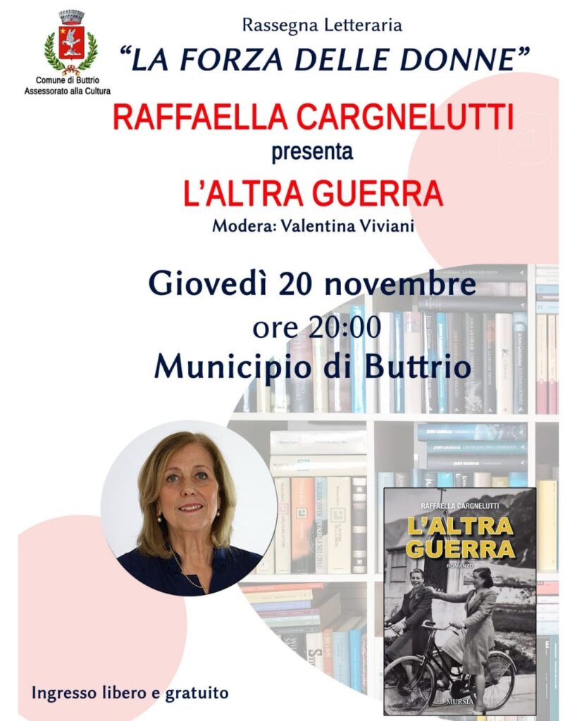 Giovedì 20 novembre alle ore 20, nella Sala Europa del Municipio di Buttrio, torna la rassegna “La forza delle donne” con un nuovo appuntamento dedicato alla narrazione femminile. Protagonista della serata la scrittrice Raffaella Cargnelutti, che presenterà il suo romanzo “L’altra guerra”, un intenso racconto che intreccia memoria e coraggio in un’epoca di grandi trasformazioni, e invita a riflettere sul ruolo delle donne nella costruzione della memoria collettiva (e sulle storie spesso taciute). Dialogherà con l’autrice la giornalista Valentina Viviani. Ingresso libero.