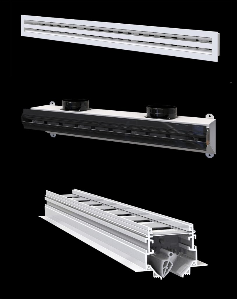 • Diffusori lineari a vista in PVC: disponibili in diverse varianti, con numero di feritoie e regolazioni adattabili a specifiche esigenze di portata d’aria e lunghezza di getto.
