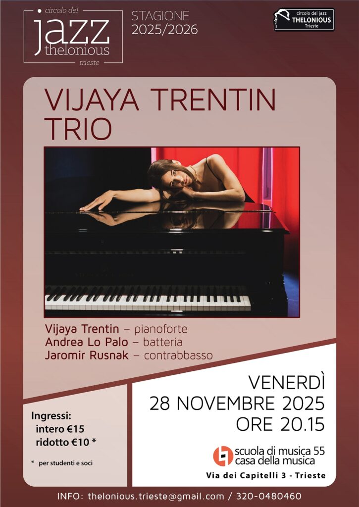 Venerdì 28 novembre, alle ore 20.15 presso l’auditorium della Casa della Musica in via dei Capitelli 3 a Trieste, il Circolo del Jazz Thelonious presenta il VIJAYA TRENTIN TRIO (Vijaya Trentin – pianoforte / Andrea Lo Palo – batteria / Jaromir Rusnak – contrabbasso).
