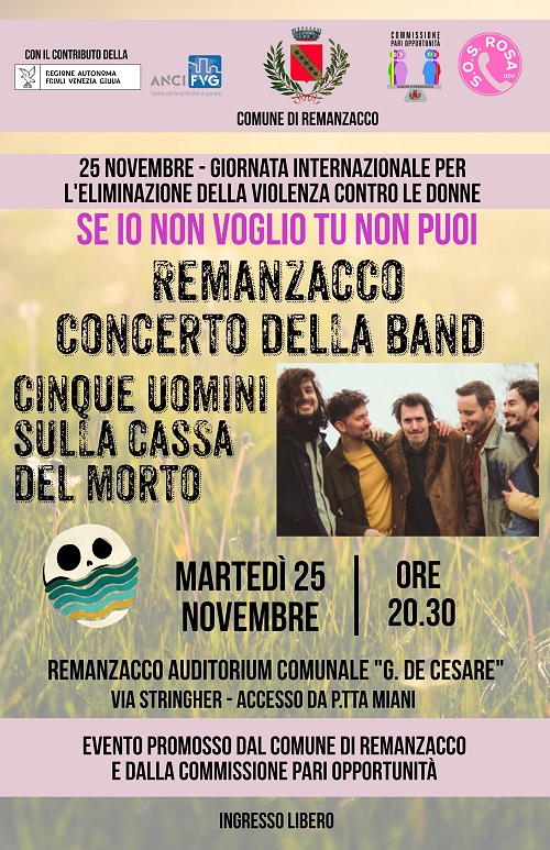 In occasione della Giornata internazionale per l’eliminazione della violenza contro le donne, il Comune di Remanzacco e la Commissione Pari Opportunità con il sostegno della Regione FVG propongono – dopo la presentazione del film “C’è ancora domani”, del libro “L’inchino dei girasoli” di Sarah Benedetto e la “Passeggiata di riflessione” con gli studenti della scuola secondaria di primo grado – il concerto della band “Cinque Uomini sulla cassa del morto”, in programma martedì 25 novembre alle ore 20.30 presso l’Auditorium comunale “Giovanni de Cesare”. Il messaggio scelto per la campagna è “Se io non voglio, tu non puoi”, a sottolineare il diritto all’autodeterminazione e al rispetto. Sempre nell’ambito della sensibilizzazione contro la violenza di genere, sabato 22 novembre alle ore 14.15 è prevista la “Passeggiata sociale” con il gruppo “1000 Passi”; il ritrovo è presso il monumento sociale della panchina rossa lungo la SS54 (in caso di maltempo, l’iniziativa sarà rinviata a sabato 29 novembre). Gli eventi si concluderanno il 29 novembre all’Auditorium comunale, alle ore 20.30, con il concerto “Donne, parole e musica” con Chiara di Gleria, accompagnata al piano da Francesco Imbriaco, e con performance teatrali proposte dalla Commissione Pari Opportunità e Consulta Giovani Remanzacco.