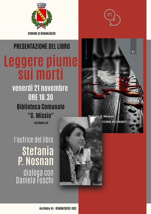 Venerdì 21 novembre alle ore 18.30 nella biblioteca comunale sarà presentato il libro “Leggere piume sui morti” di Stefania P. Nosnan, in dialogo con Daniela Foschi. L’incontro offrirà uno sguardo originale sul tema della memoria e della narrazione. Sempre venerdì, alle ore 16, appuntamento con “L’ora del racconto”, ciclo di letture animate per bambini dai 3 ai 6 anni a cura dei volontari de “La Banda delle Storie di Remanzacco”. Per i più piccoli e le famiglie, prosegue la rassegna “Domenica al Cinema”, organizzata da Pro Loco Comune Remanzacco APS e Associazione Genitori Remanzacco con il patrocinio comunale; le proiezioni si svolgono all’Auditorium alle ore 15.30, con ingresso a offerta libera e merenda durante l’intervallo. Dopo “Ainbo – Spirito dell’Amazzonia” e “Il re dei ladri”, domenica 23 novembre sarà la volta di “Dora e la città perduta”. Domenica 30 novembre alle ore 17.30, presso l’Auditorium comunale, si concluderà la rassegna teatrale in lingua friulana con lo spettacolo “O sin dal gjat”.