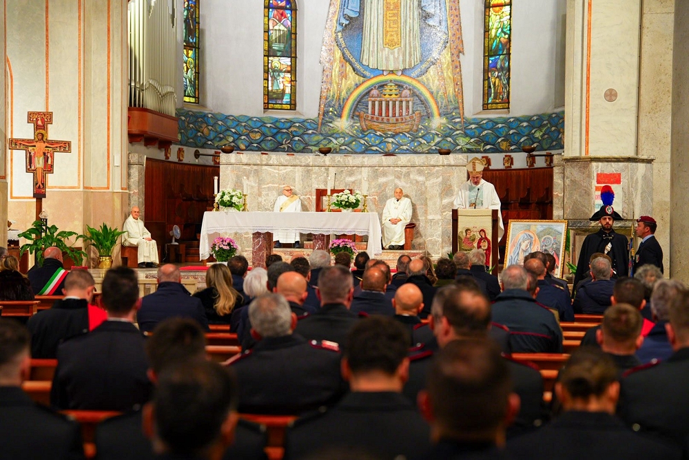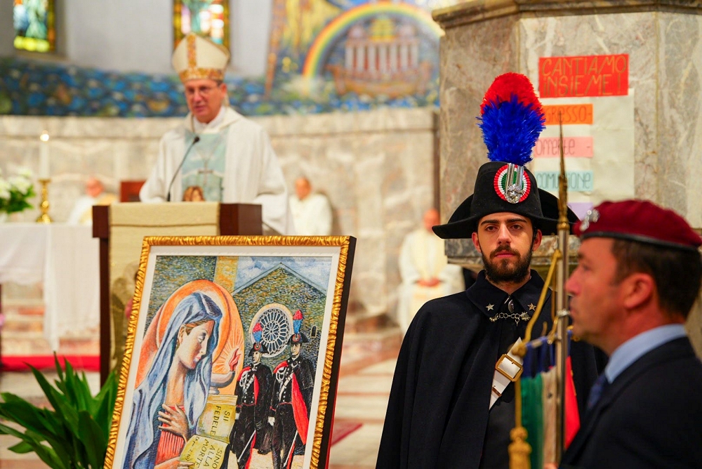 Durante l’omelia il Vescovo ha ricordato il profondo legame tra l’Arma dei Carabinieri e la figura della Vergine Maria, proclamata patrona dell’Arma da Papa Pio XII il 21 novembre 1949. Una scelta che riflette il motto “Nei secoli fedele”, radicato nella stessa virtù di fedeltà che caratterizza la missione quotidiana di ogni carabiniere: “Ringraziamo la fedeltà dei carabinieri, che sono, per il nostro paese, un segno di dedizione e di servizio e anche di sacrificio. Un po’ ovunque, disseminati nelle nostre città vediamo donne e uomini dell’Arma che portano sicurezza e cercano di lottare contro il crimine nella fedeltà al loro servizio, con dedizione e professionalità e tutto questo ci solleciti a seguirne con fedeltà l’esempio”.