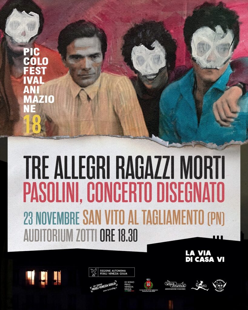 Alle ore 22 sempre all’Auditorium Zotti (replica il 23 novembre alle 18.30) in occasione del cinquantesimo anniversario della morte di Pier Paolo Pasolini, i Tre Allegri Ragazzi Morti trasformano il palco in una tela vivente con lo spettacolo “Pasolini, concerto disegnato”, un’esplosione di musica, parole e immagini che racconta la vita e l’opera del poeta friulano. Il progetto nasce dal graphic novel omonimo di Davide Toffolo, pubblicato nel 2002 e tradotto in cinque lingue. Dal fumetto germoglia la performance scenica, dove la voce e la matita di Toffolo si intrecciano con le note della band, dando vita a un Pasolini sospeso tra rock, poesia e rivoluzione. Durante lo spettacolo, le canzoni dei Tre Allegri Ragazzi Morti si alternano a momenti di improvvisazione, loop psichedelici e registrazioni della voce autentica del poeta, accompagnati da immagini tratte dalle sue opere più intense. La performance unisce le due anime fondamentali del gruppo pordenonese – il disegno e la musica – in un’esperienza che celebra oltre trent’anni di attività dei Tre Allegri Ragazzi Morti, band mascherata simbolo della scena indipendente italiana. A impreziosire le tre date speciali in Friuli-Venezia Giulia sarà l’ospite d’eccezione Adriano Viterbini, chitarrista tra i più originali del panorama rock italiano, già collaboratore del gruppo con Bud Spencer Blues Explosion, Jovanotti e I Hate My Village.