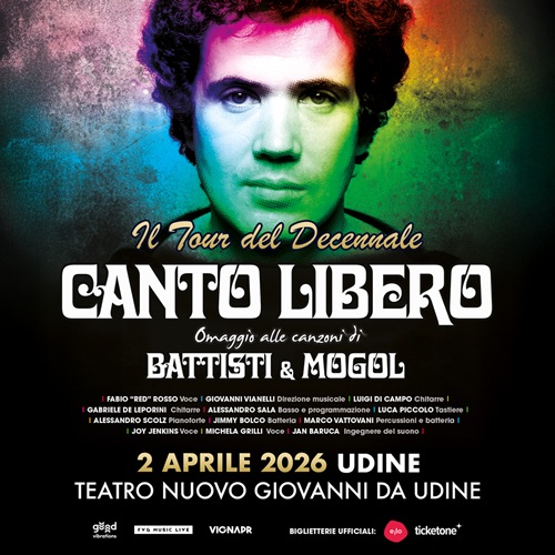 Sono passati più di 25 anni dalla scomparsa di Lucio Battisti, ma le sue canzoni continuano a suonare tramandandosi di generazione in generazione, anche con Canto Libero – Omaggio alle canzoni di Battisti e Mogol, il progetto tributo più acclamato in Italia! Attualmente in tour nei principali teatri italiani (sono tre i concerti consecutivi in programma al Teatro Olimpico di Roma dall’1 al 3 dicembre), dopo il tutto esaurito dell’estate 2024 in Castello, a grande richiesta Good Vibrations Entertainment e VignaPR, in collaborazione con FVG Music Live, annunciano il ritorno di Canto Libero a Udine il 2 aprile 2026 al Teatro Nuovo Giovanni da Udine. I biglietti per il nuovo appuntamento saranno in vendita a partire dalle ore 10:00 di giovedì 27 novembre online su Eilo.it, Ticketone.it, nei punti vendita autorizzati e alle biglietterie del teatro.