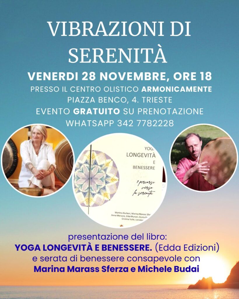 Venerdì 28 novembre alle ore 18.00 presso Armonicamente – Centro Olistico Integrato di piazza Benco 4 a Trieste, si terrà la presentazione del libro “Yoga, longevità e benessere. 7 percorsi verso la serenità” (Edda Edizioni, 2025). La coautrice Marina Marass Sferza dialogherà con Michele Budai, psicologo, musicoterapeuta e percussionista.Due professionisti, un unico obiettivo: il benessere consapevole attraverso l’armonia interiore. Per l’occasione è stato organizzato l’evento gratuito “Vibrazioni di serenità”: un momento dedicato al benessere consapevole, durante il quale sarà possibile sperimentare diverse attività, come mindfulness, respiro consapevole, rilassamento guidato con il suono delle campane tibetane e dell’handpan. L’obiettivo dell’evento è far conoscere anche al pubblico senior i benefici dello yoga e di pratiche che stimolano mente e creatività, come arteterapia, musicoterapia, suonoterapia e mindfulness. La partecipazione è gratuita, ma i posti sono limitati: per prenotare è sufficiente inviare un messaggio WhatsApp al numero 342 7782228.