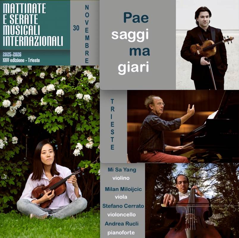DOMENICA 30 NOVEMBRE 2025 alle ore 11.00 in Sala Luttazzi del Magazzino 26 in Porto Vecchio a Trieste si terrà il quinto concerto delle MATTINATE E SERATE MUSICALI INTERNAZIONALI di Trieste 2025-2026 “PAESAGGI MAGIARI” e avremo come ospite l’ensemble “Sergio Gaggia” formato dal violista Milan Miloijcic proveniente da Vienna, il violoncellista Stefano Cerrato e Andrea Rucli dall’Italia e capitanato dalla violinista Mi Sa Yang vincitrice di importanti concorsi internazionali (Concorso Internazionale Yehudi Menuhin, 3° Premio e Premio Speciale della Giuria al Concorso Internazionale di Musica di Sendai (Giappone) e 1° Premio in trio con pianoforte al 55° Concorso Internazionale di Musica Maria Canals di Barcellona.Il quartetto presenterà un programma trascinante comprendente pagine di ispirazione tzigana di Beethoven, Schumann, Bartok e Brahms.