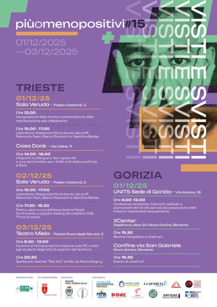 L’apertura ufficiale si terrà il 1° dicembre alle ore 12.00 presso la Sala Veruda del Comune di Trieste con la presentazione dello stato epidemiologico attuale dell’infezione da HIV da parte alla degli specialisti del Centro per le MST e della Clinica di Malattie Infettive.I nuovi farmaci oggi disponibili sono estremamente efficaci sia nella prevenzione sia nel trattamento dell’HIV: riducono la carica virale a livelli non rilevabili, eliminando il rischio di trasmissione. Un traguardo scientifico rivoluzionario, con effetti decisivi sulla salute pubblica e sulla qualità di vita delle persone sieropositive. Tuttavia, le infezioni sessualmente trasmesse rimangono diffuse e numerose: informazione, consapevolezza e prevenzione restano fondamentali.Arte, parole e partecipazione