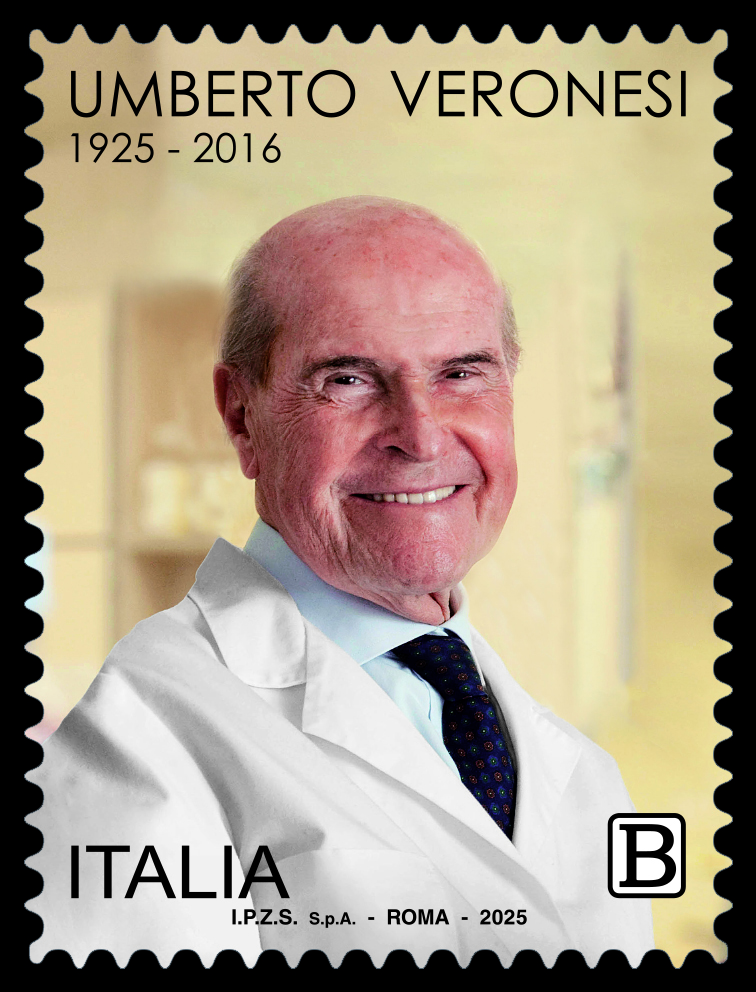 Poste Italiane comunica che oggi 28 novembre 2025 viene emesso dal Ministero delle Imprese e del Made in Italy un francobollo appartenente alla serie tematica “i valori sociali” dedicato a Umberto Veronesi, nel centenario della nascita, relativo al valore della tariffa B pari a 1.30€