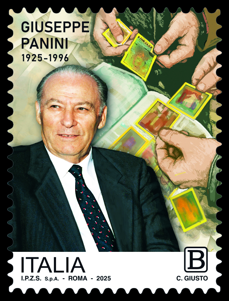 La vignetta raffigura un ritratto fotografico di Giuseppe Panini, imprenditore modenese fondatore della Panini, casa editrice divenuta simbolo del collezionismo in tutto il mondo e ancora oggi marchio di eccellenza italiana riconosciuto a livello globale. Sullo sfondo s’intravedono mani di collezionisti intenti a scambiarsi figurine.