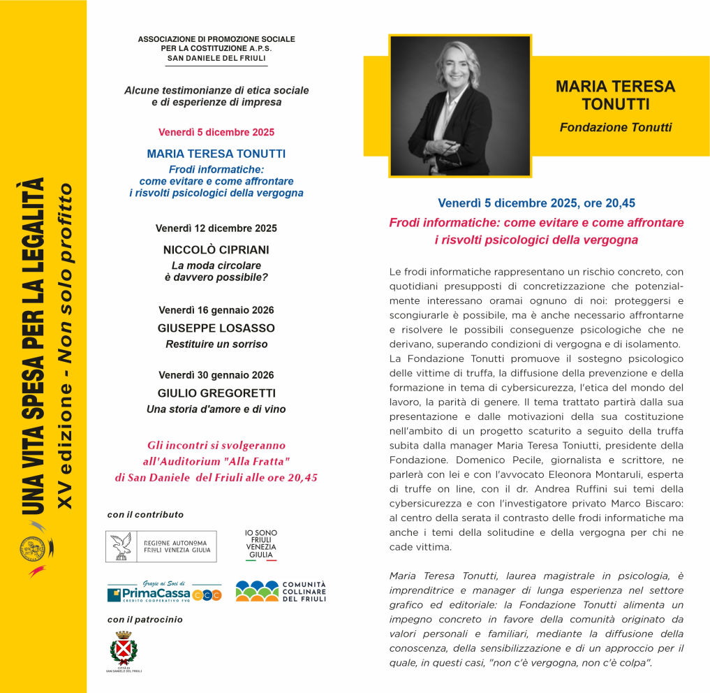 La serata, condotta dal giornalista e scrittore Domenico Pecile, offrirà un’occasione di confronto pubblico sui rischi delle truffe online e sull’importanza della prevenzione, temi al centro della missione della Fondazione Tonutti. L’ente, nato nel 2025 per offrire ascolto, accompagnamento qualificato e percorsi di sensibilizzazione sul fenomeno delle frodi informatiche, si è sviluppato a partire dall’esperienza personale della sua presidente, Maria Teresa Tonutti, vittima di una truffa di particolare gravità. La Fondazione, presentata al territorio lo scorso settembre, si propone come presidio sociale e culturale per favorire la conoscenza, la tutela e il recupero della fiducia da parte delle persone coinvolte.