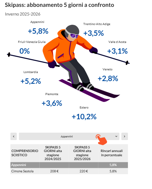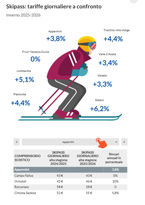 Nel quadro nazionale, l’Appennino rappresenta un caso interessante. Pur registrando un aumento medio del 3,8%, alcune località hanno deciso di non toccare il prezzo del giornaliero, altre invece prendono il largo. Campo Felice, per esempio, conferma la tariffa di 43 euro, così come Roccaraso mantiene quella di 58 euro, invariata rispetto allo scorso inverno. Questo approccio prudente contrasta con l’aumento applicato da Ovindoli, che passa da 42 a 46 euro, segnando un incremento netto del 10%, tra i più marcati dell’intera dorsale appenninica. Il comprensorio sciistico del Cimone (Sestola), nell’area modenese, registra un aumento meno vistoso, ma più alto della media nazionale: il ticket giornaliero passa da 52 a 55 euro (+5,8%).