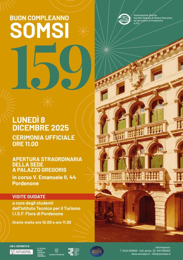 Ad accogliere e guidare i visitatori nella storia e negli spazi di attività della SOMSI di Pordenone, Centro di divulgazione culturale riconosciuto dalla Regione Friuli Venezia Giulia, saranno le studentesse dell’Istituto Tecnico per il Turismo F. Flora di Pordenone, uno dei molti Istituti scolastici che collaborano stabilmente con l’Operaia nelle sue numerose attività, mentre alle 11.00 è in programma la cerimonia ufficiale di benvenuto alla cittadinanza, ai Soci e alle autorità, a cominciare dai rappresentanti degli Enti che sostengono l’iniziativa, come la Regione Friuli Venezia Giulia e il Comune di Pordenone. Sarà questa l’occasione non solo per tracciare una breve sintesi dell’anno trascorso, ma anche per dare le prime anticipazioni delle iniziative che attendono la SOMSI nel 2026, anno particolarmente importante perché segnerà il 160° di fondazione, un traguardo di grande significato che non mancherà di portare alla città di Pordenone e al territorio regionale nuove proposte culturali da condividere con la comunità, secondo la storica vocazione del sodalizio verso “le attività e le iniziative rivolte a favorire l’elevazione culturale, sociale e morale dei cittadini”.