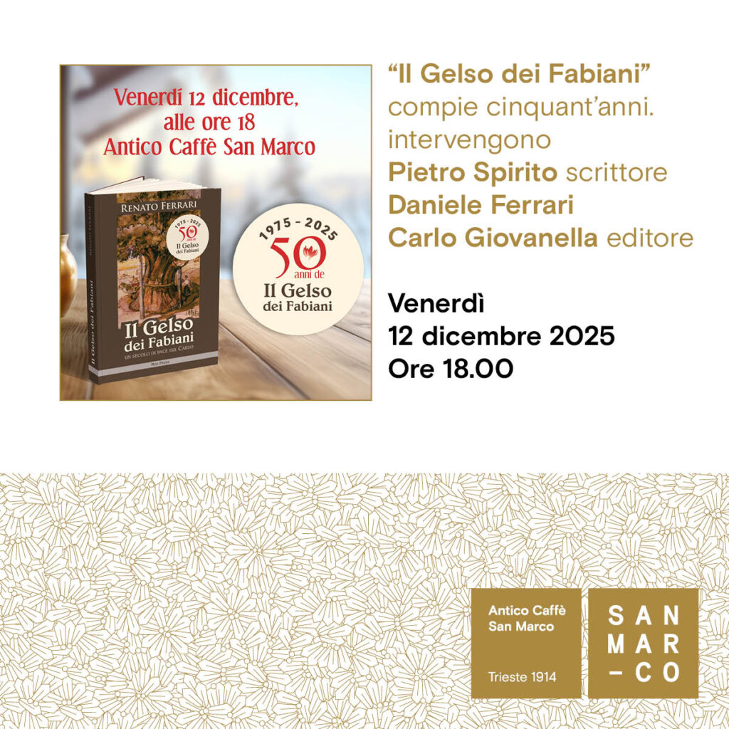 Dicembre 1975-Dicembre 2025: “Il Gelso dei Fabiani. Un secolo di pace sul Carso” compie cinquant’anni. Per celebrare la ricorrenza la Mgs Press ha organizzato un incontro al quale ha invitato Daniele Ferrari, figlio di Renato, autore del libro amato da generazioni di lettori.Venerdì 12 dicembre, alle 18, all’Antico Caffè san Marco, il giornalista e scrittore Pietro Spirito ripercorrerà la storia del Gelso e dei suoi principali protagonisti, Charlotte e Anton, senza dimenticare Max Fabiani, architetto dell’Impero e urbanista tra i più illustri d’Europa.Alla serata interverrà anche l’attore Giacomo Segulia che oltre ad alcuni brani del libro leggerà un intervento del figlio di Renato, Daniele, refrattario ad ogni esibizionismo, che ha ricordato il padre e le disavventure della sua famiglia.Come ha scritto Aurelia Gruber Benco nella prefazione alla prima edizione, pubblicata dall’editore Marino Bolaffio, “è un libro contraddittorio su una città contraddittoria e il suo contraddittorio rapporto col Carso. Un libro con velleità di romanzo e sapida consistenza di cronaca. Scritto oggi per un tempo di ieri”.