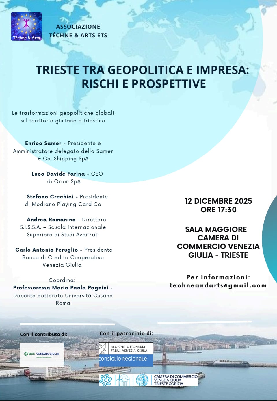 L’Associazione Téchne & Arts ETS promuove venerdì 12 dicembre alle ore 17.30 presso la Sala Maggiore della Camera di Commercio Venezia Giulia, l’incontro pubblico “Trieste tra geopolitica e impresa: rischi e prospettive”, un appuntamento pensato per offrire uno sguardo approfondito sulle trasformazioni globali che stanno ridefinendo gli equilibri economici e politici internazionali, e sulle loro ricadute dirette sul territorio giuliano. In un contesto segnato da tensioni crescenti, mutamenti negli assetti energetici, nuovo protagonismo delle grandi potenze e continue riconfigurazioni delle rotte commerciali, la necessità di comprendere come questi processi si riflettano sulle imprese e sulle istituzioni locali diventa un passaggio strategico per costruire una visione condivisa del futuro.