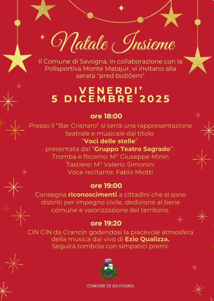 Venerdì 5 dicembre, presso il Bar Crisnaro, si è tenuta la festa di paese “Natale Insieme”, organizzata dal Comune di Savogna in collaborazione con la Polisportiva Monte Matajur. Un momento di convivialità che ha unito cultura, musica e celebrazione del senso civico.